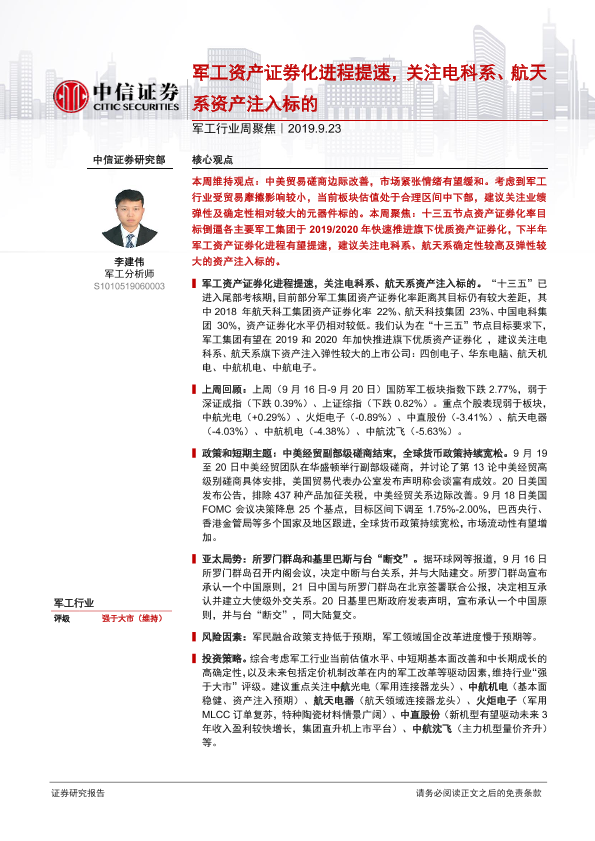【中信证券】【20190923】20190923-中信证券-军工行业周聚焦:军工资产证券化进程提速,关注电科系、航天系资产注入标的-23页