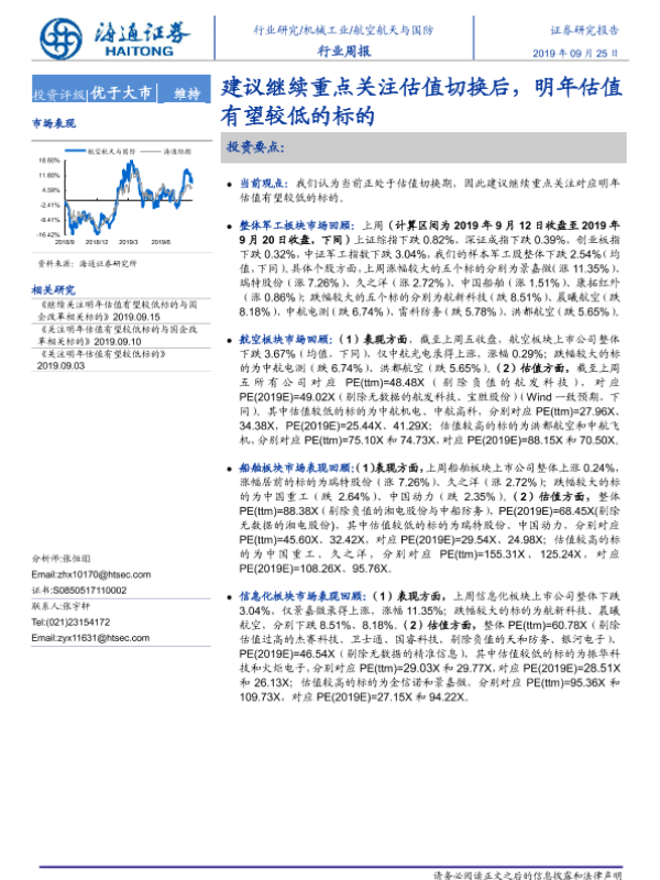 【海通证券】【20190925】20190925-海通证券-航空航天与国防行业周报:建议继续重点关注估值切换后,明年估值有望较低的标的-4页