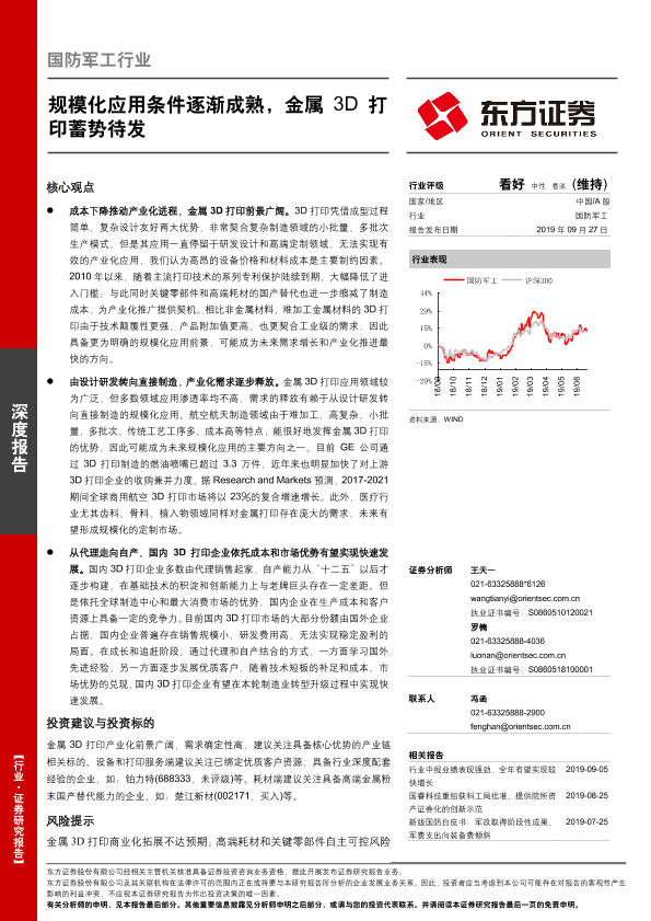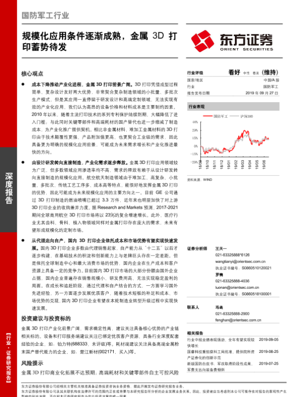 【东方证券】【20190927】国防军工行业:规模化应用条件逐渐成熟,金属3D打印蓄势待发-32页