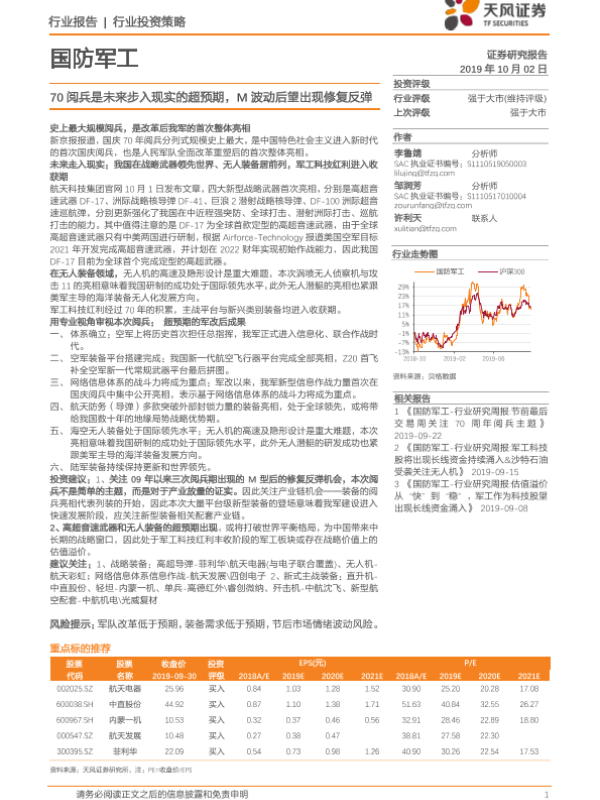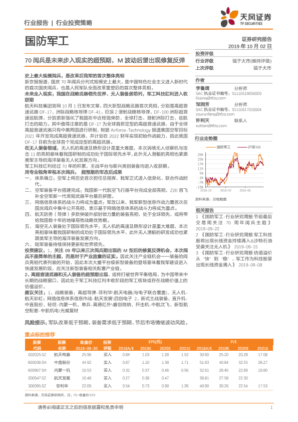 【天风证券】【20191002】国防军工:70阅兵是未来步入现实的超预期,M波动后望出现修复反弹-9页