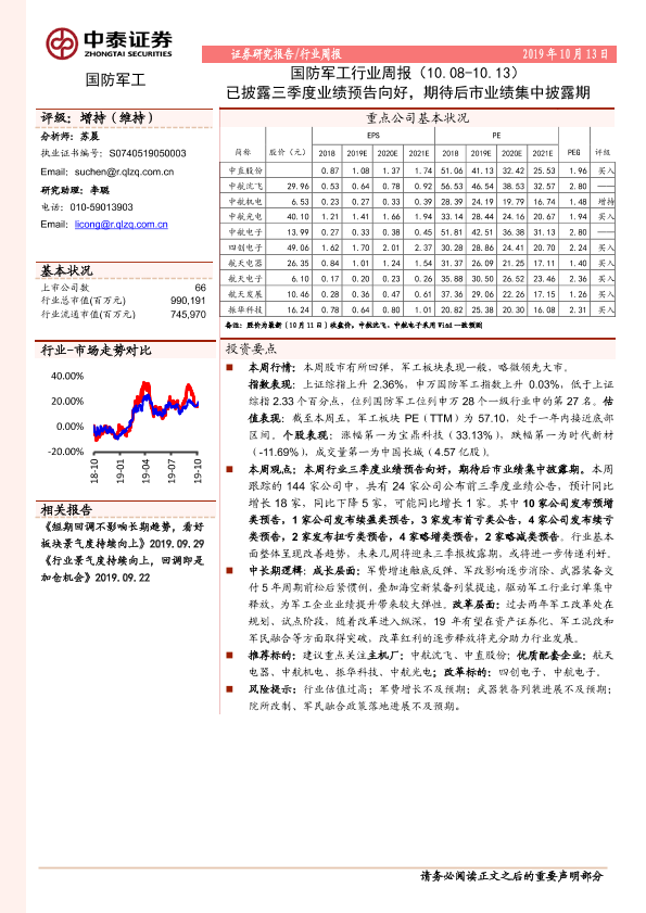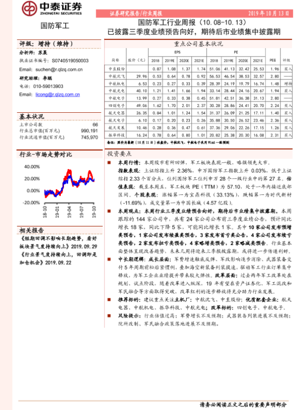 【中泰证券】【20191013】20191013-中泰证券-国防军工行业周报:已披露三季度业绩预告向好,期待后市业绩集中披露期-13页