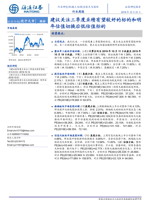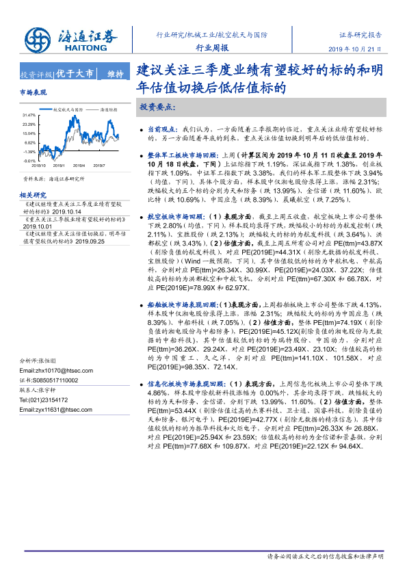 【海通证券】【20191021】20191021-海通证券-航空航天与国防行业周报:建议关注三季度业绩有望较好的标的和明年估值切换后低估值标的-4页