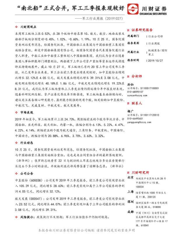 【川财证券】【20191027】20191027-川财证券-军工行业周报:“南北船”正式合并,军工三季报表现较好-9页