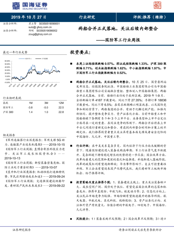 【国海证券】【20191027】国防军工行业周报:两船合并正式落地,关注后续内部整合-13页