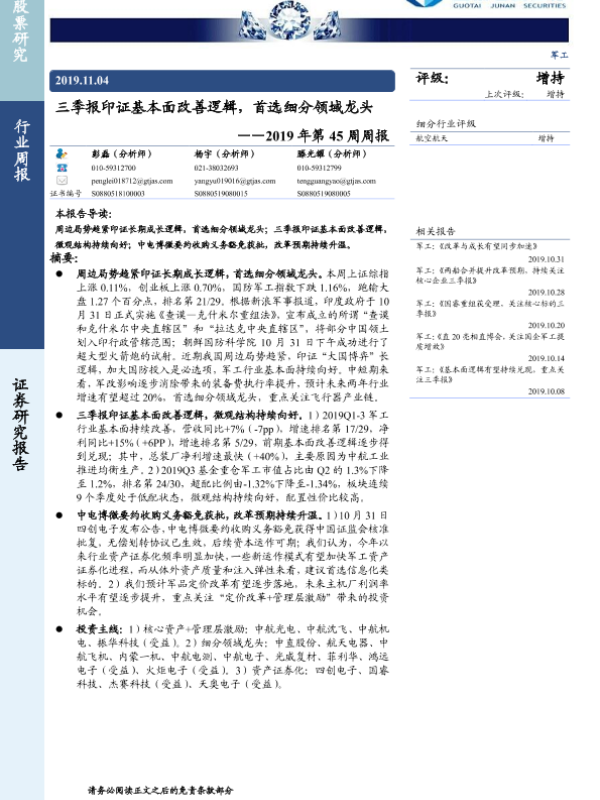 【国泰君安证券】【20191104】2019年第45周周报-三季报印证基本面改善逻辑,首选细分领域龙头-10页