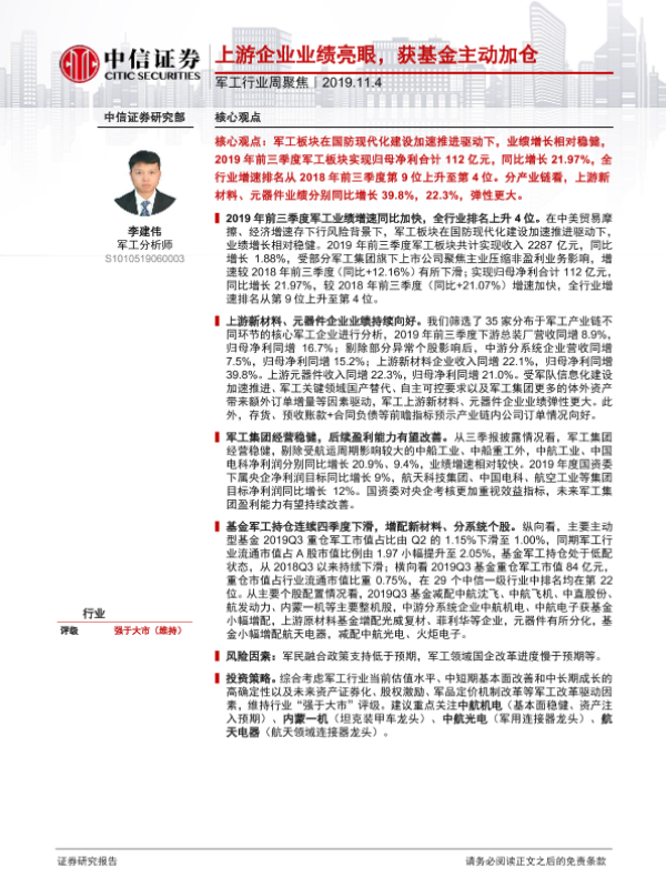 【中信证券】【20191104】20191104-中信证券-军工行业周聚焦:上游企业业绩亮眼,获基金主动加仓-17页