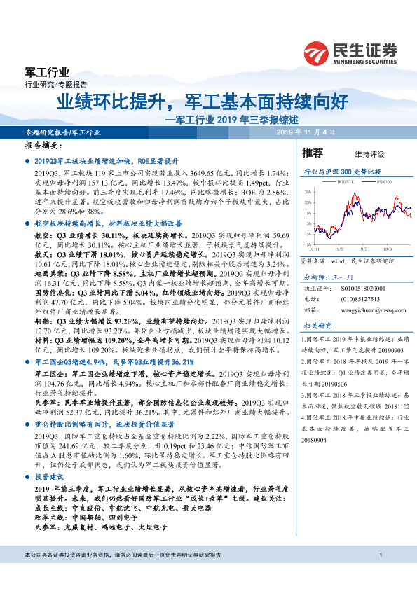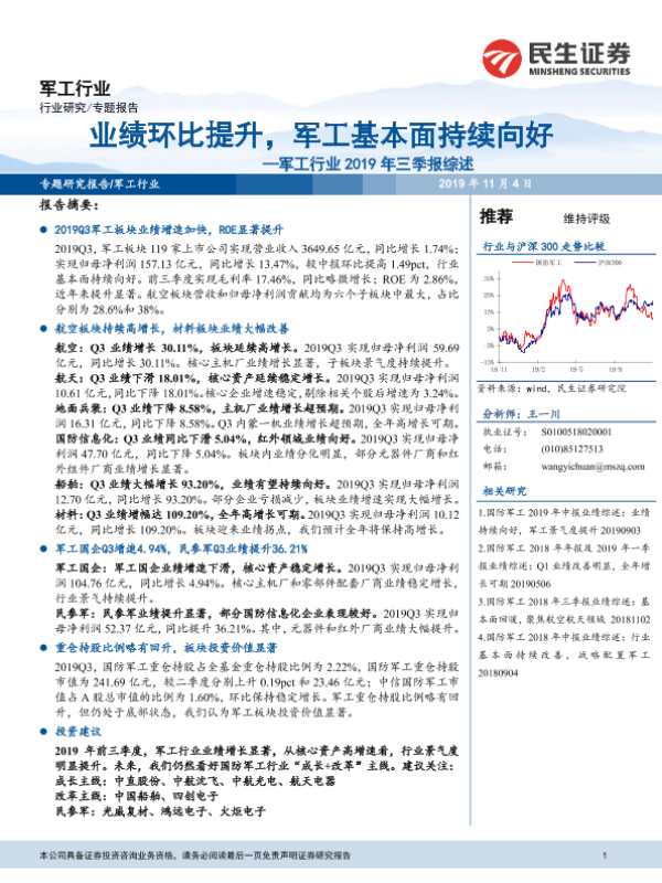 【民生证券】【20191104】军工行业2019年三季报综述:业绩环比提升,军工基本面持续向好-15页
