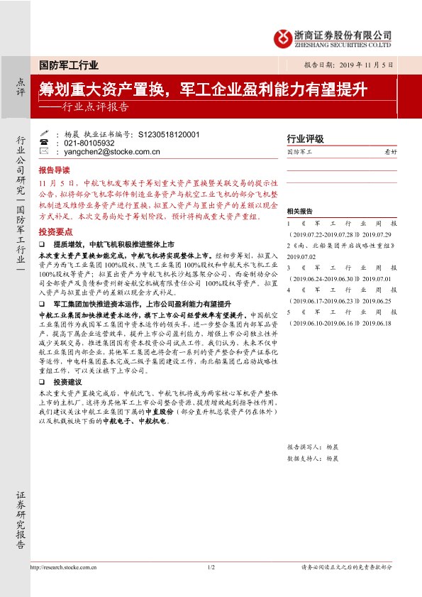 【浙商证券】【20191105】国防军工行业点评:筹划重大资产置换,军工企业盈利能力有望提升-2页