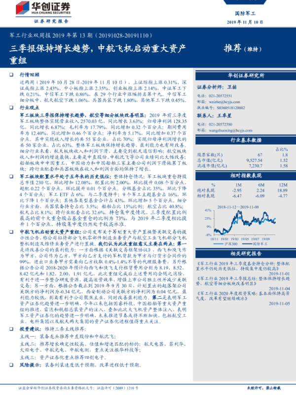 【华创证券】【20191110】军工行业双周报2019年第13期:三季报保持增长趋势,中航飞机启动重大资产重组-26页