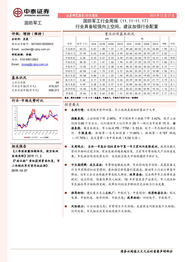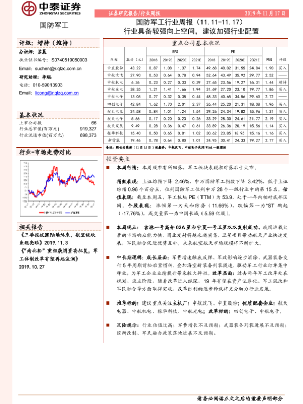 【中泰证券】【20191117】20191117-中泰证券-国防军工行业周报:行业具备较强向上空间,建议加强行业配置-13页
