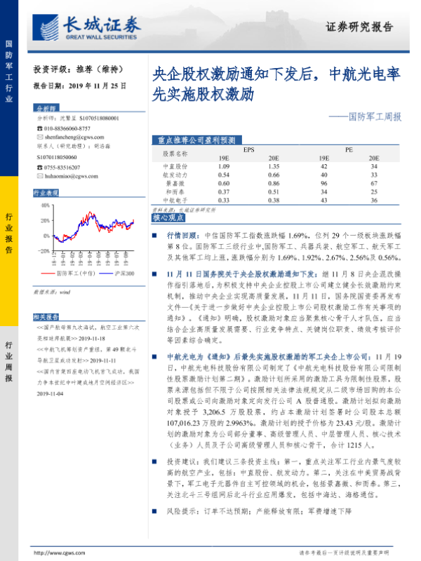 【长城证券】【20191125】20191125-长城证券-国防军工周报:央企股权激励通知下发后,中航光电率先实施股权激励-14页