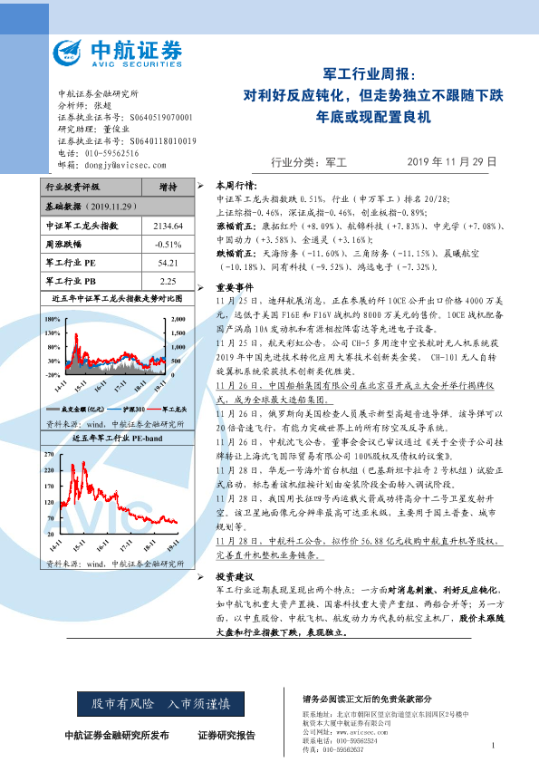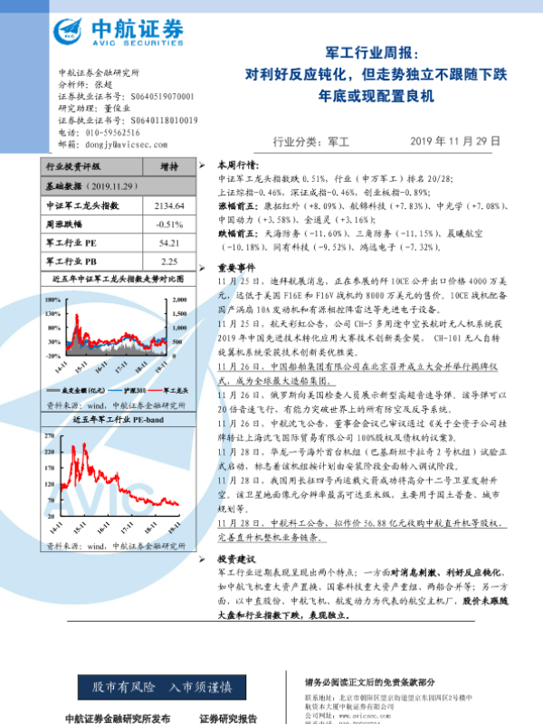 【中航证券】【20191129】20191129-中航证券-军工行业周报:对利好反应钝化,但走势独立不跟随下跌,年底或现配置良机-3页