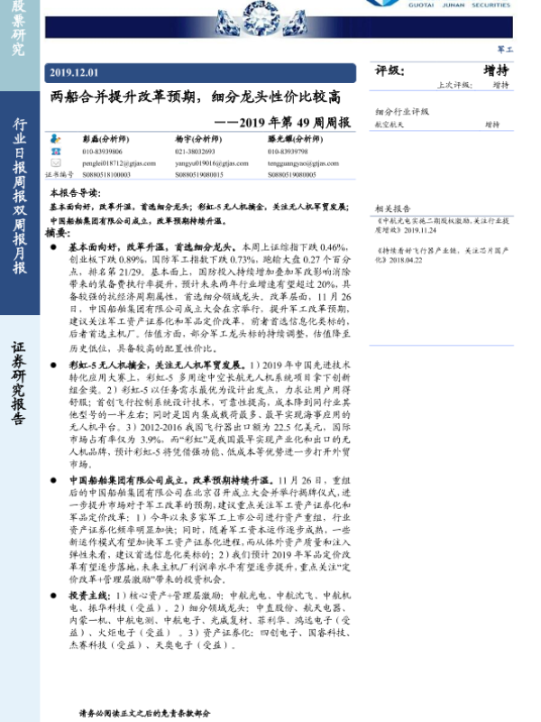 【国泰君安证券】【20191201】军工2019年第49周周报:两船合并提升改革预期,细分龙头性价比较高-11页