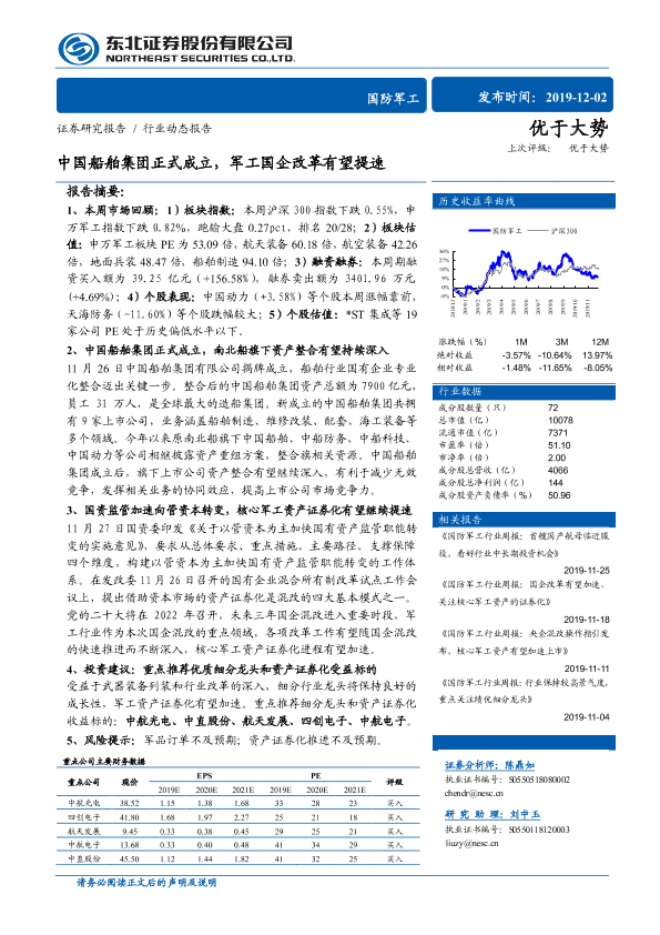 【东北证券】【20191202】20191202-东北证券-国防军工行业动态报告:中国船舶集团正式成立,军工国企改革有望提速-22页