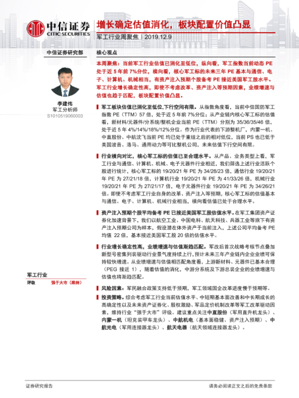【中信证券】【20191209】20191209-中信证券-军工行业周聚焦:增长确定估值消化,板块配置价值凸显-16页