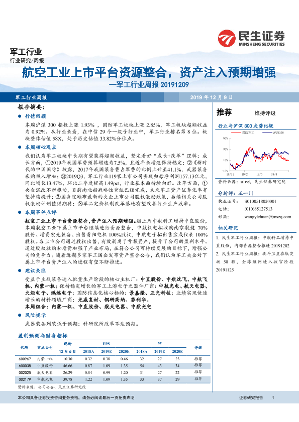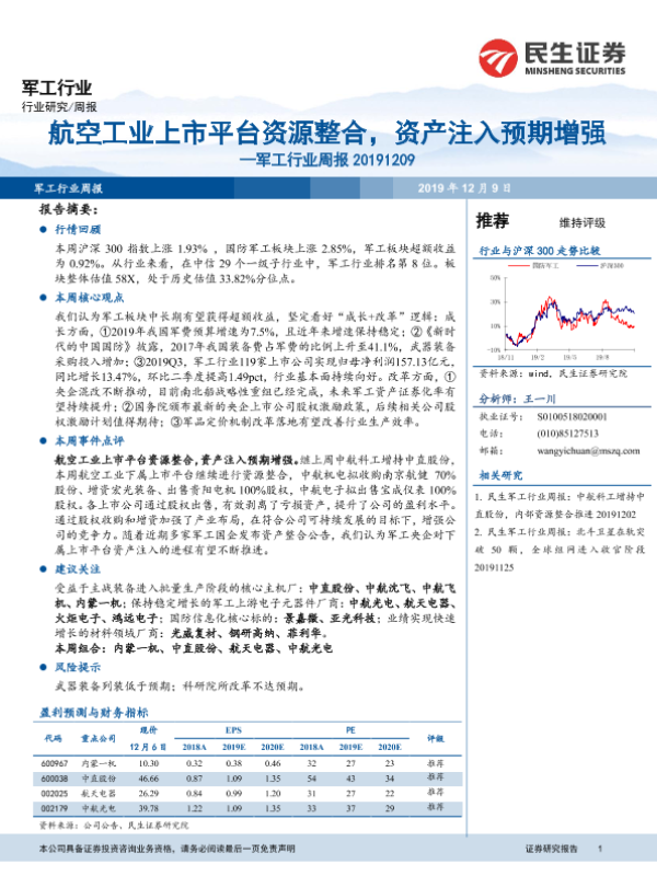 【民生证券】【20191209】20191209-民生证券-军工行业周报:航空工业上市平台资源整合,资产注入预期增强-27页