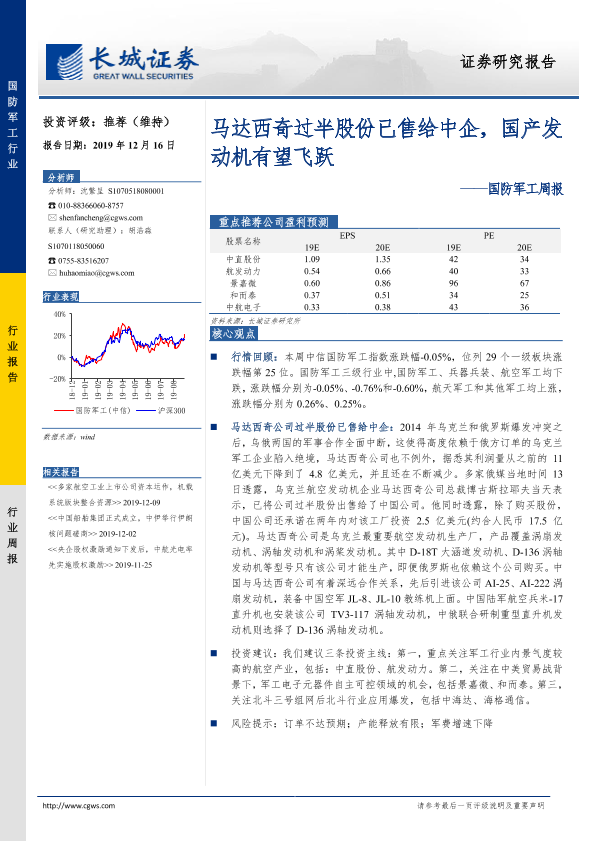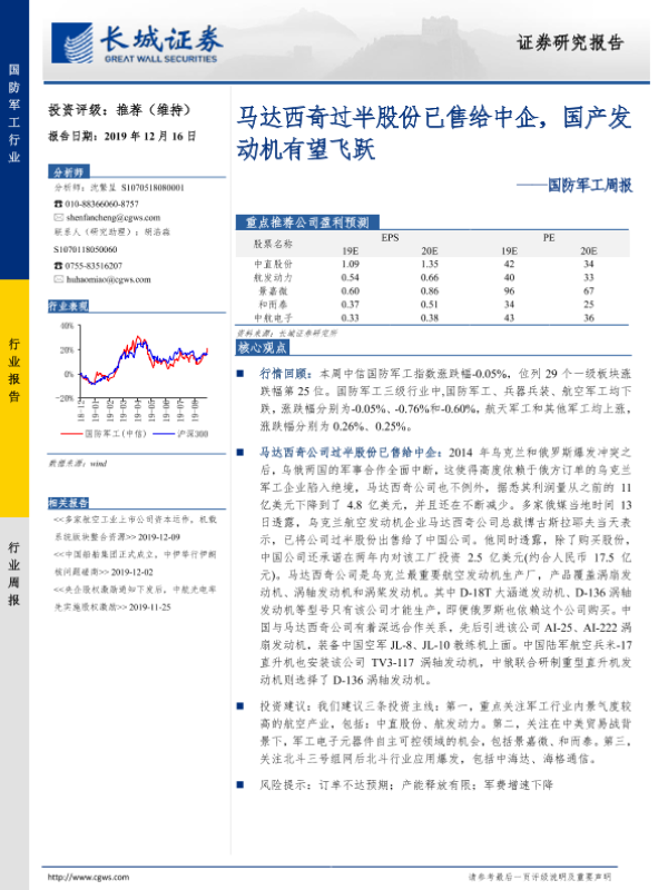 【长城证券】【20191216】20191216-长城证券-国防军工周报:马达西奇过半股份已售给中企,国产发动机有望飞跃-11页