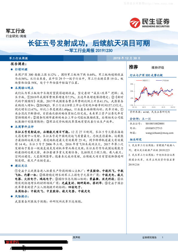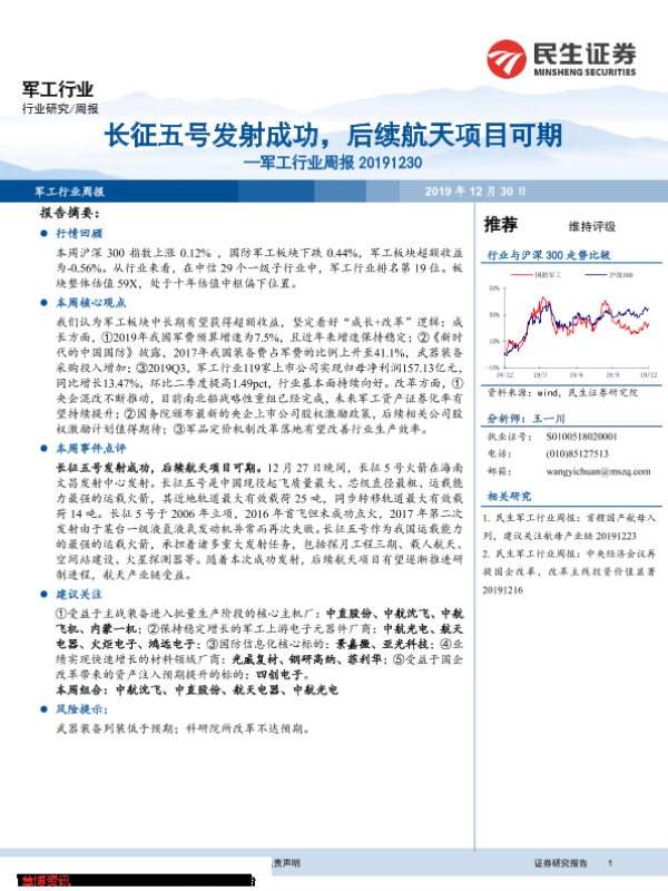 【民生证券】【20191230】20191230-民生证券-军工行业周报:长征五号发射成功,后续航天项目可期-29页