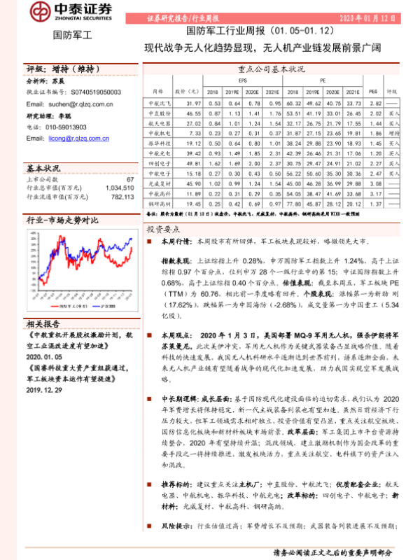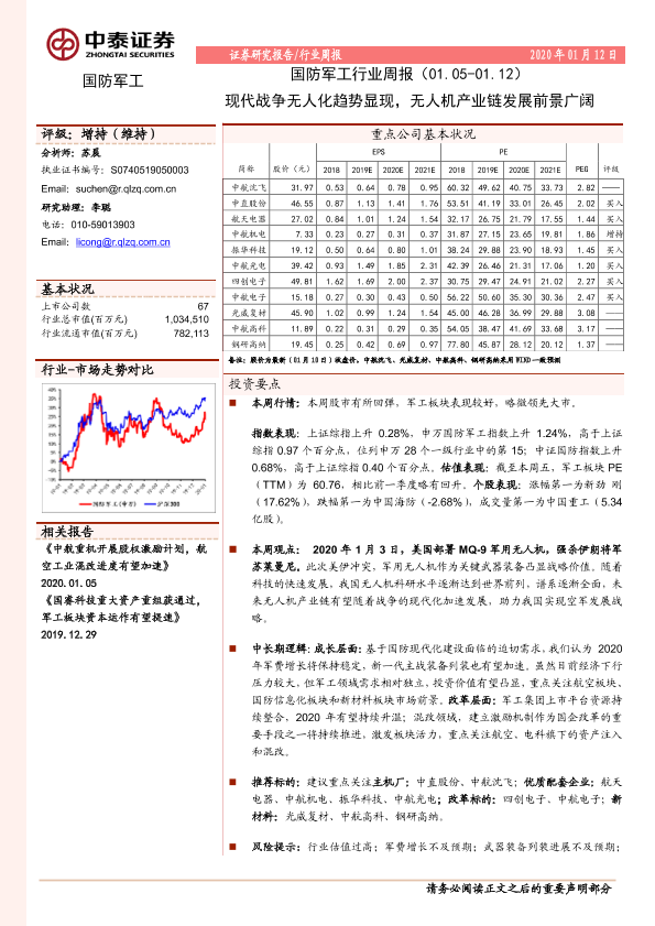 【中泰证券】【20200112】国防军工行业周报:现代战争无人化趋势显现,无人机产业链发展前景广阔-13页