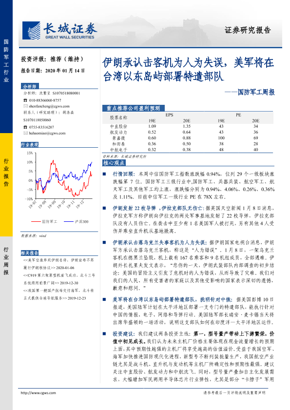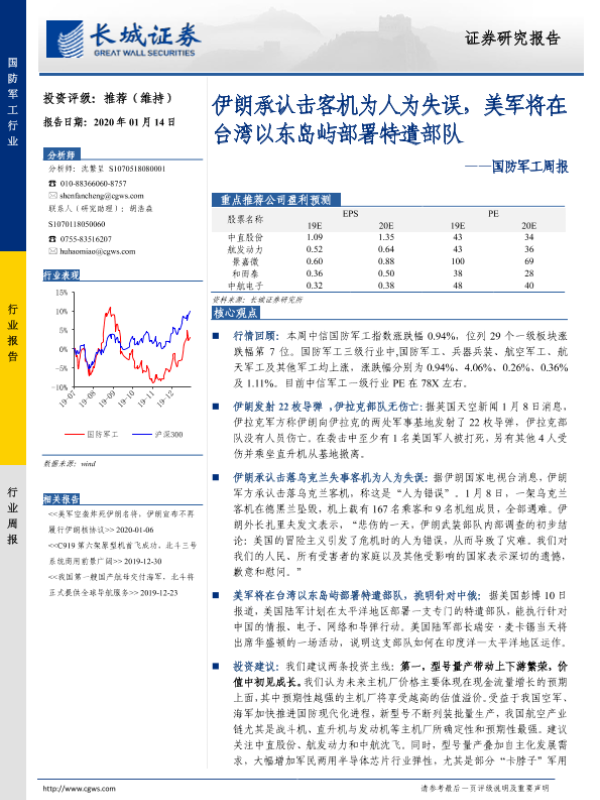 【长城证券】【20200114】20200114-长城证券-国防军工周报:伊朗承认击客机为人为失误,美军将在台湾以东岛屿部署特遣部队-12页
