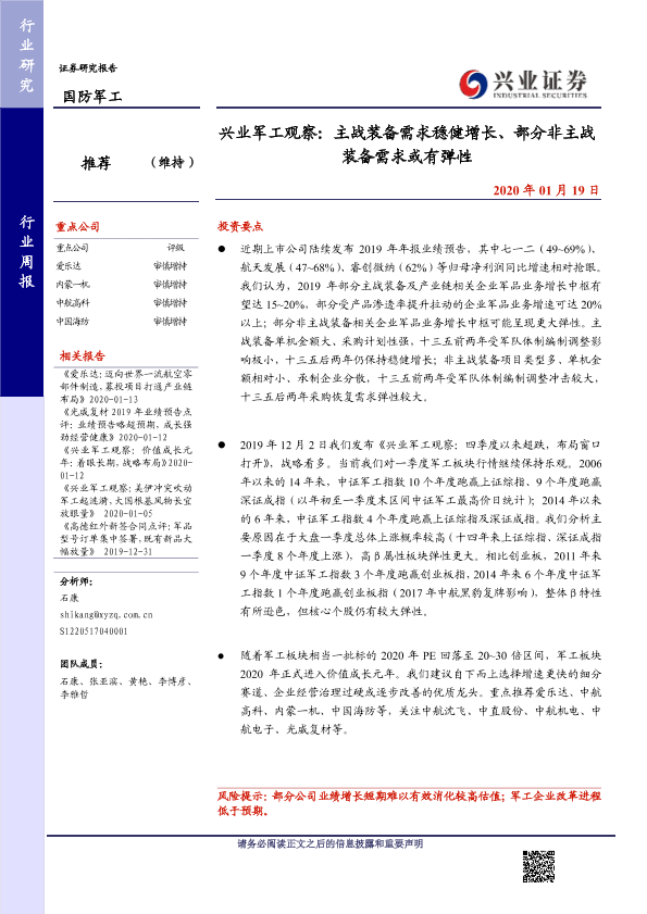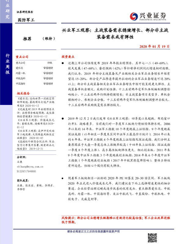 【兴业证券】【20200119】兴业军工观察:主战装备需求稳健增长、部分非主战装备需求或有弹性-13页