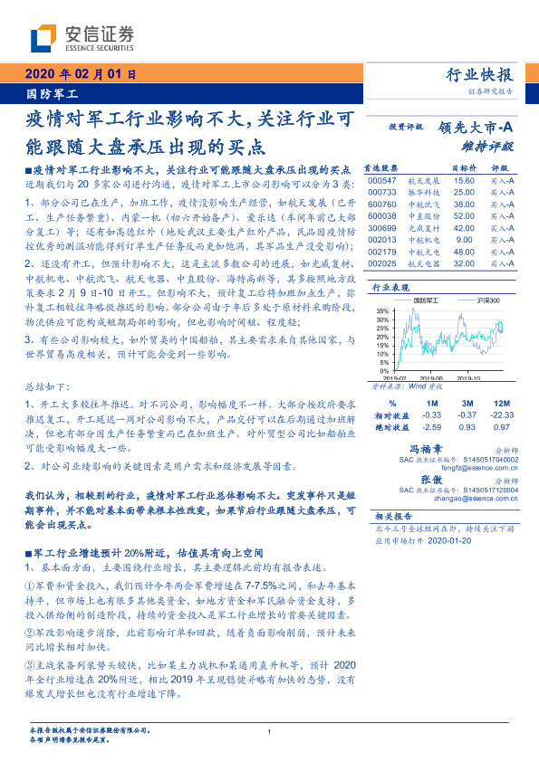 【安信证券】【20200201】国防军工:疫情对军工行业影响不大,关注行业可能跟随大盘承压出现的买点-4页