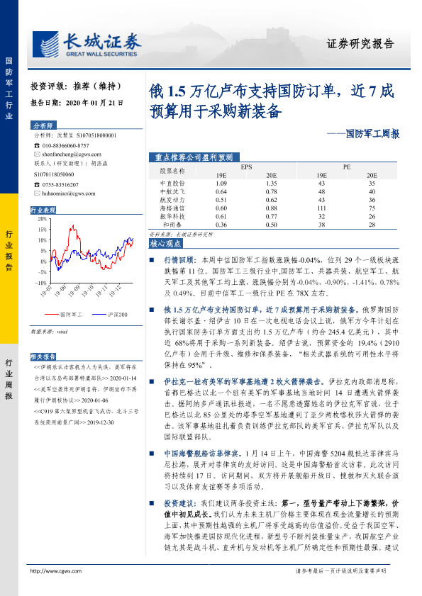 【长城证券】【20200121】20200121-长城证券-国防军工周报:俄1.5万亿卢布支持国防订单,近7成预算用于采购新装备-13页