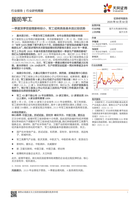 【天风证券】【20200202】国防军工行业研究周报:一季度淡季受疫情影响较小,军工或将具备基本面比较优势-5页
