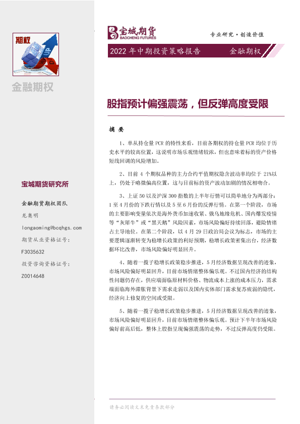 【宝城期货】【20220617】金融期权2022年中期投资策略报告:股指预计偏强震荡,但反弹高度受限-17页