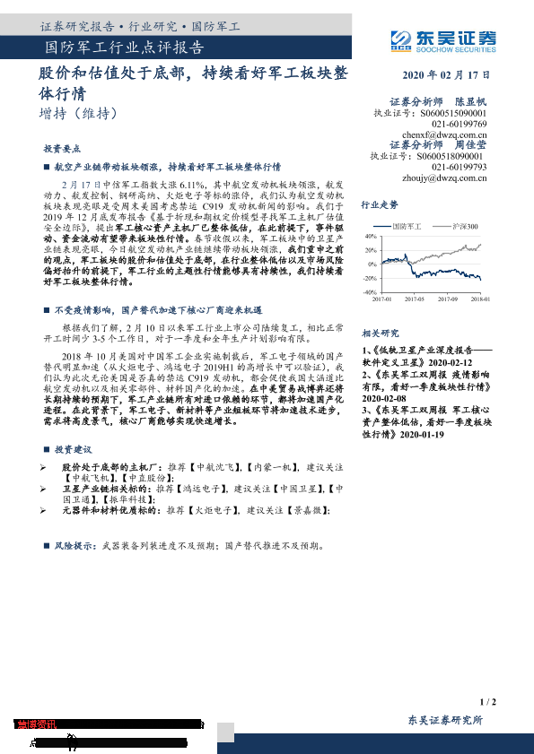【东吴证券】【20200217】国防军工行业点评报告:股价和估值处于底部,持续看好军工板块整体行情-2页