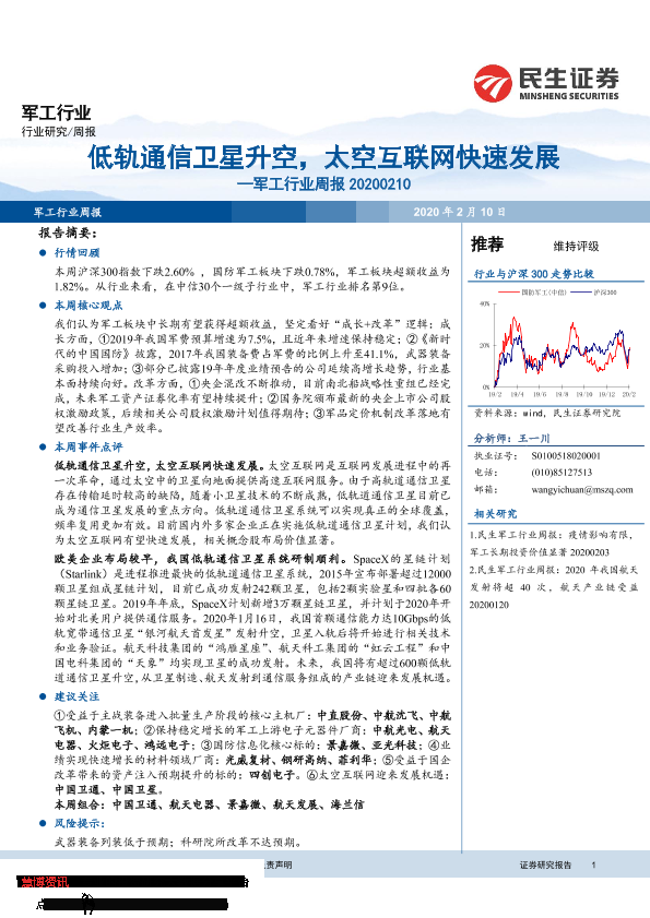 【民生证券】【20200210】20200210-民生证券-军工行业周报:低轨通信卫星升空,太空互联网快速发展-40页