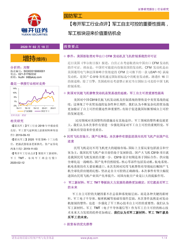 【粤开证券】【20200218】军工自主可控的重要性提高,军工板块迎来价值重估机会-4页
