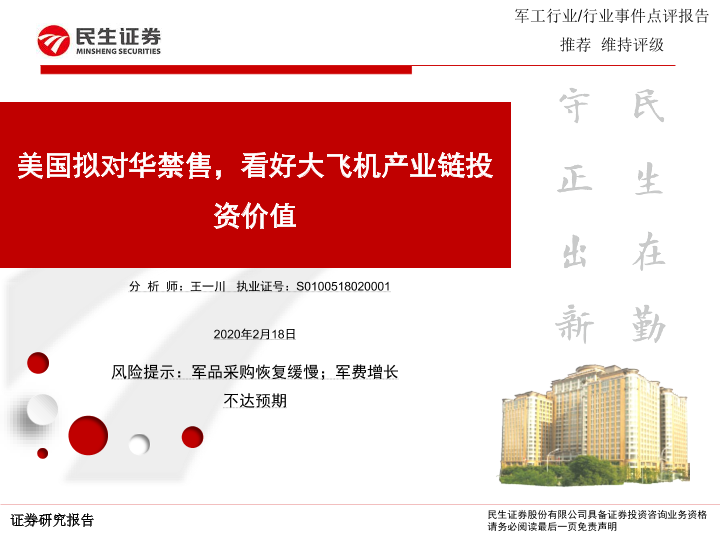 【民生证券】【20200218】军工行业:美国拟对华禁售,看好大飞机产业链投资价值-6页