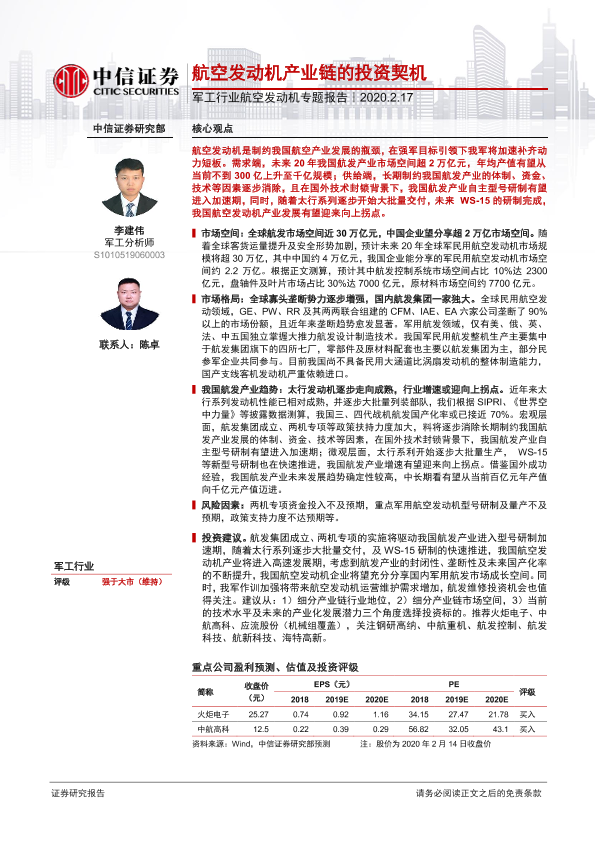 【中信证券】【20200217】军工行业航空发动机专题报告:航空发动机产业链的投资契机-33页