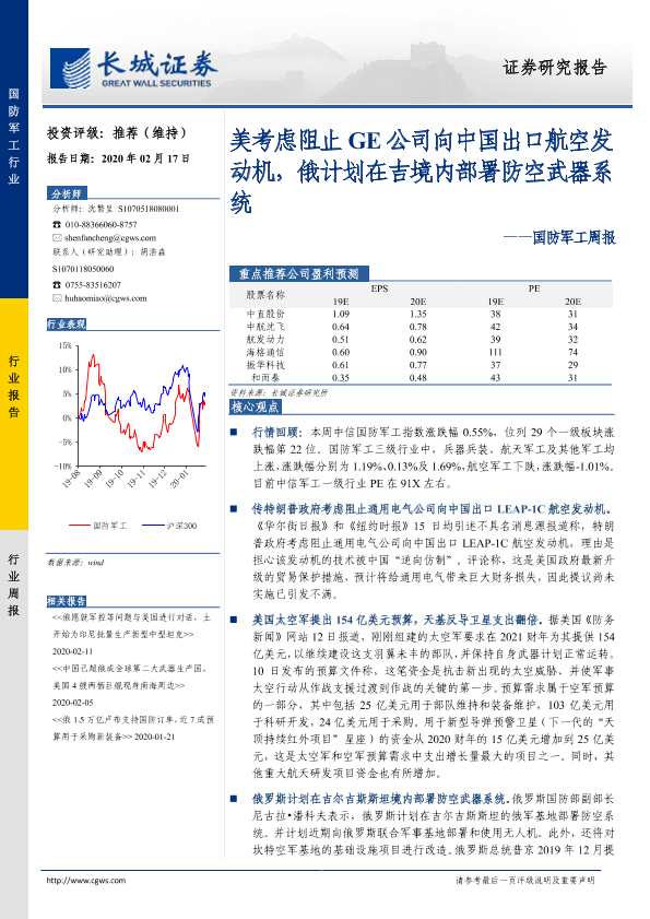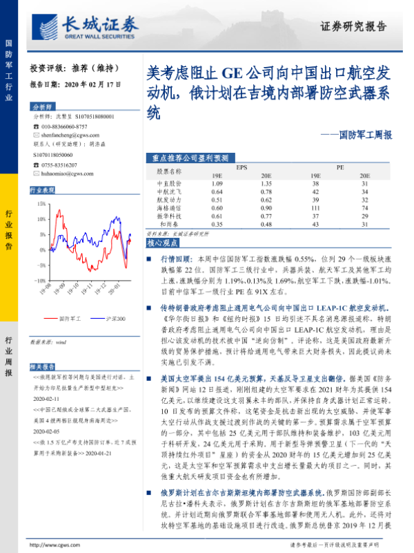 【长城证券】【20200217】20200217-长城证券-国防军工周报:美考虑阻止GE公司向中国出口航空发动机,俄计划在吉境内部署防空武器系统-14页