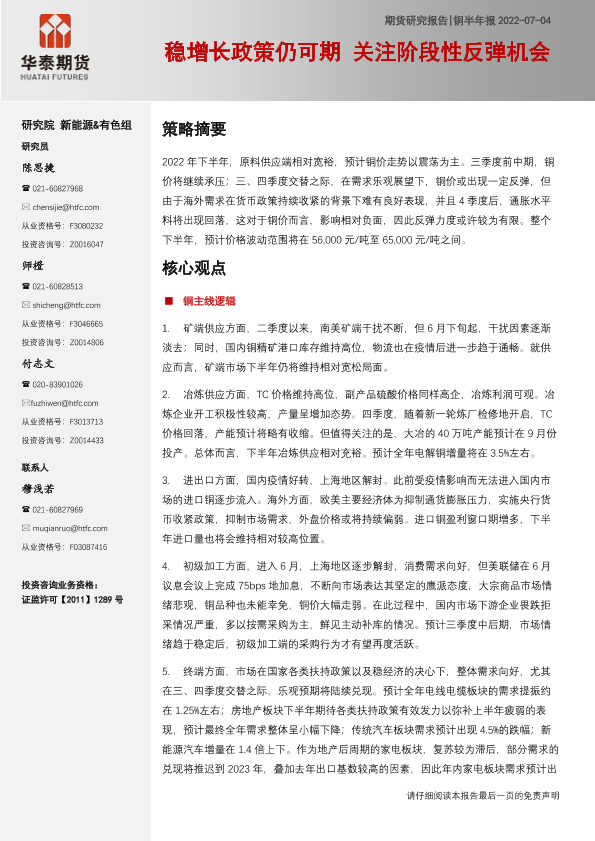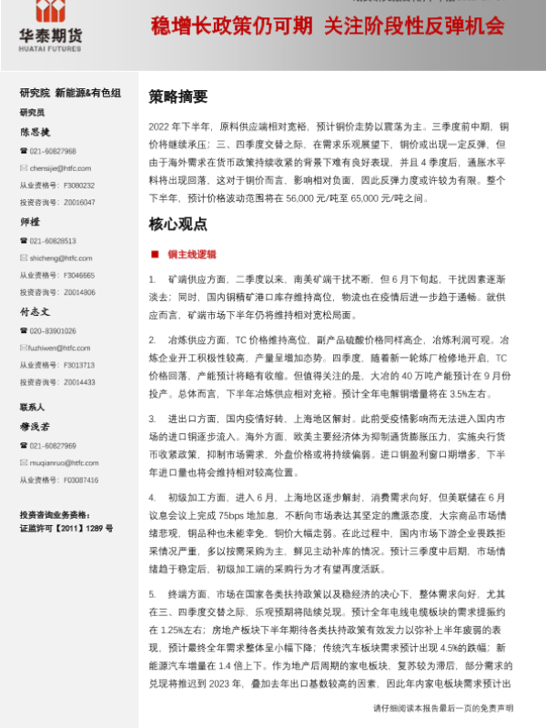 【华泰期货】【20220704】铜半年报:稳增长政策仍可期,关注阶段性反弹机会-26页