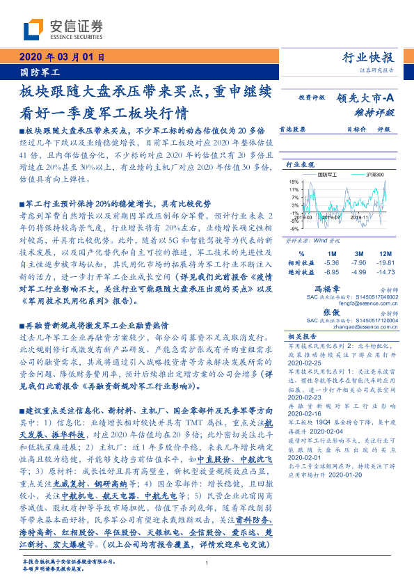 【安信证券】【20200301】国防军工:板块跟随大盘承压带来买点,重申继续看好一季度军工板块行情-4页