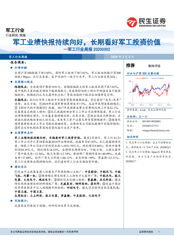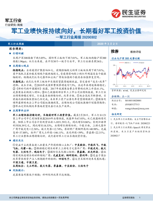 【民生证券】【20200302】20200302-民生证券-军工行业周报:军工业绩快报持续向好,长期看好军工投资价值-45页