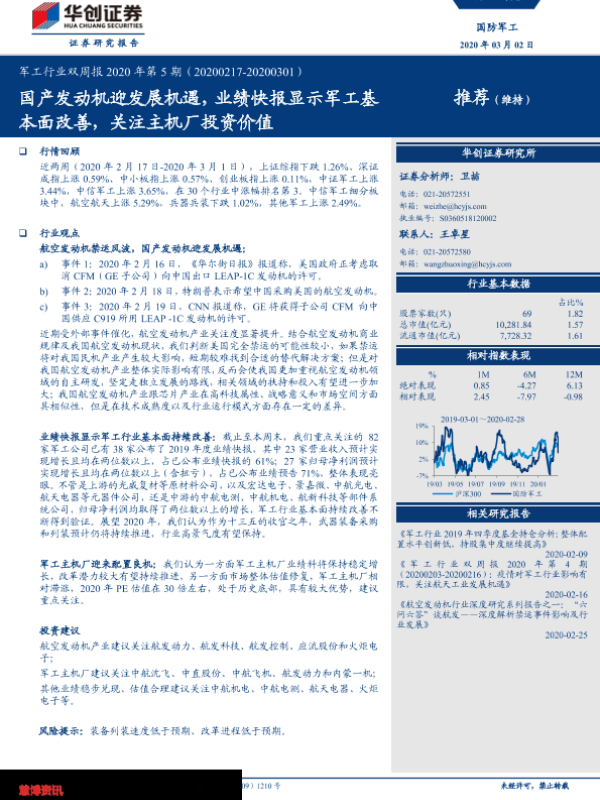 【华创证券】【20200302】军工行业双周报2020年第5期:国产发动机迎发展机遇,业绩快报显示军工基本面改善,关注主机厂投资价值-26页