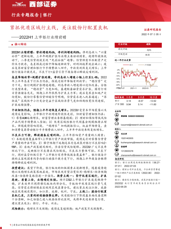【西部证券】【20220705】银行业2022H1上市银行业绩前瞻:紧抓优质区域行主线,关注股份行配置良机-24页