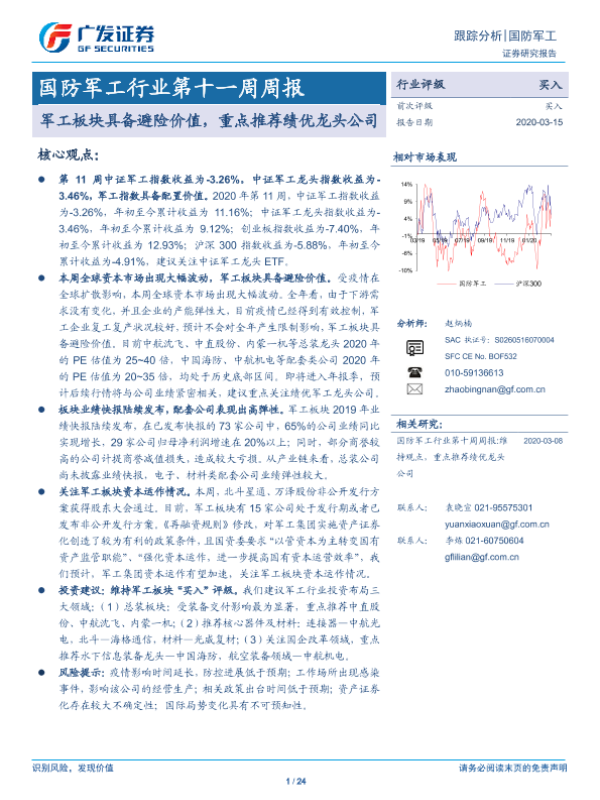 【广发证券】【20200315】国防军工行业第十一周周报:军工板块具备避险价值,重点推荐绩优龙头公司-24页