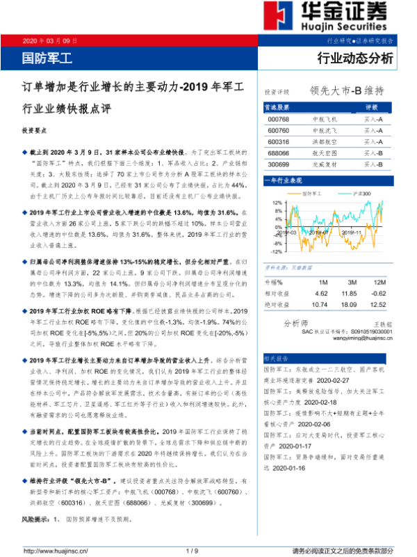 【华金证券】【20200309】2019年军工业绩快报点评:订单增加是行业增长的主要动力-9页