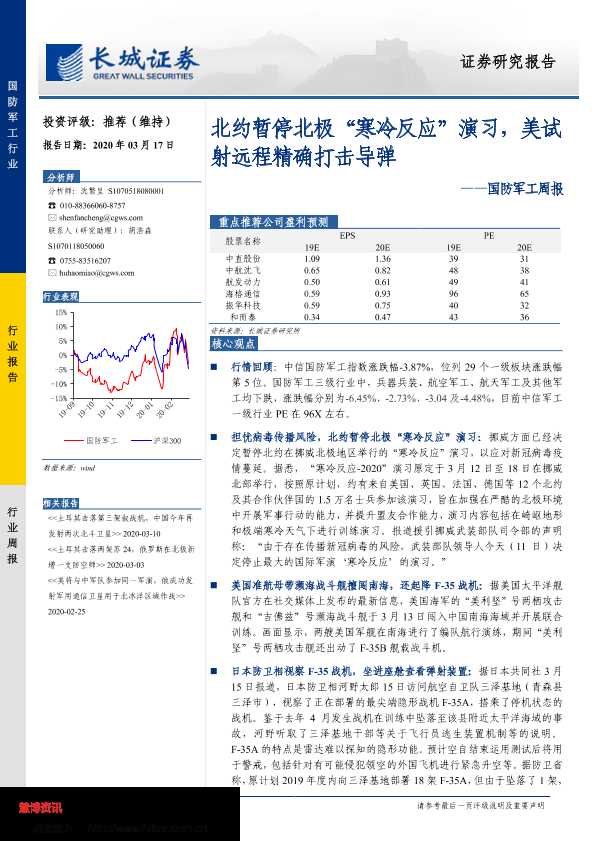 【长城证券】【20200317】20200317-长城证券-国防军工周报:北约暂停北极“寒冷反应”演习,美试射远程精确打击导弹-13页