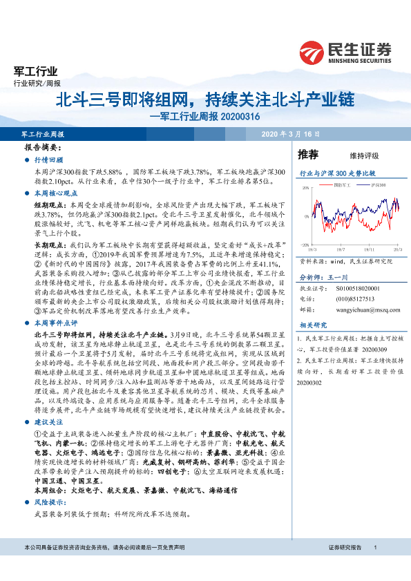 【民生证券】【20200316】20200316-民生证券-军工行业周报:北斗三号即将组网,持续关注北斗产业链-41页