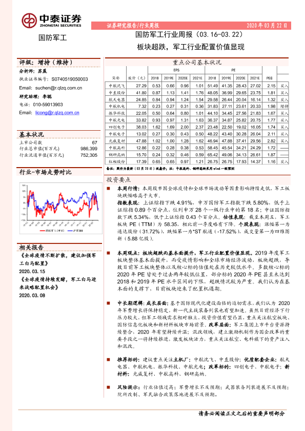 【中泰证券】【20200322】国防军工行业周报:板块超跌,军工行业配置价值显现-17页