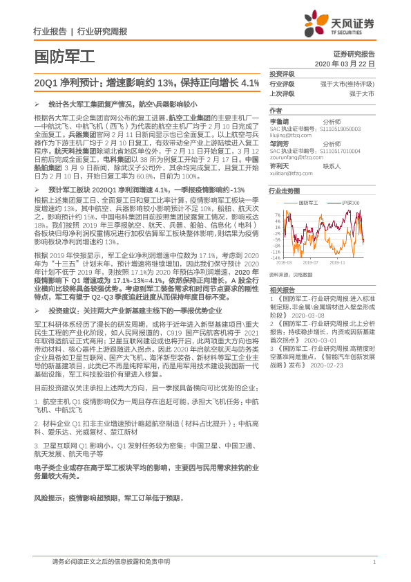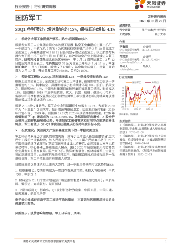 【天风证券】【20200322】国防军工行业研究周报:20Q1净利预计:增速影响约13%,保持正向增长4.1%-2页