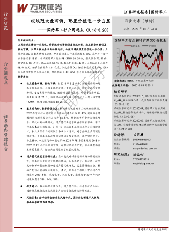 【万联证券】【20200323】20200323-万联证券-国防军工行业周观点:板块随大盘回调,配置价值进一步凸显-11页