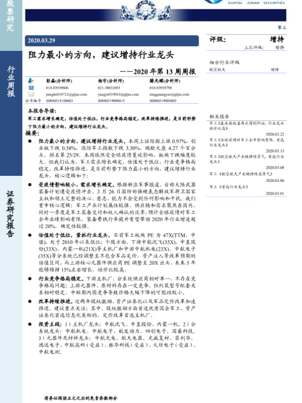 军工行业 增持建议 改革推进 疫情影响 行业龙头