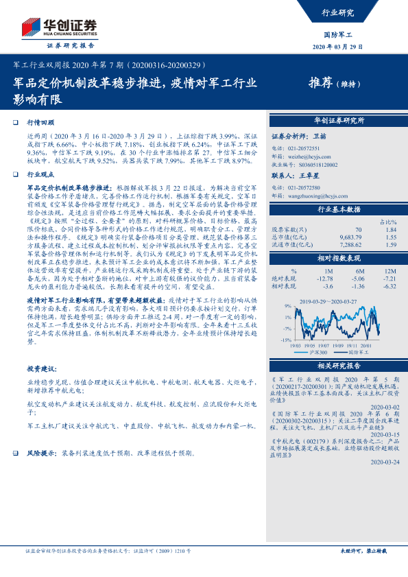【华创证券】【20200329】军工行业双周报2020年第7期:军品定价机制改革稳步推进,疫情对军工行业影响有限-22页