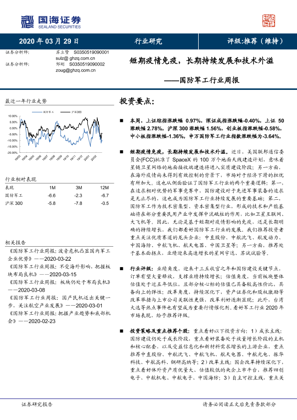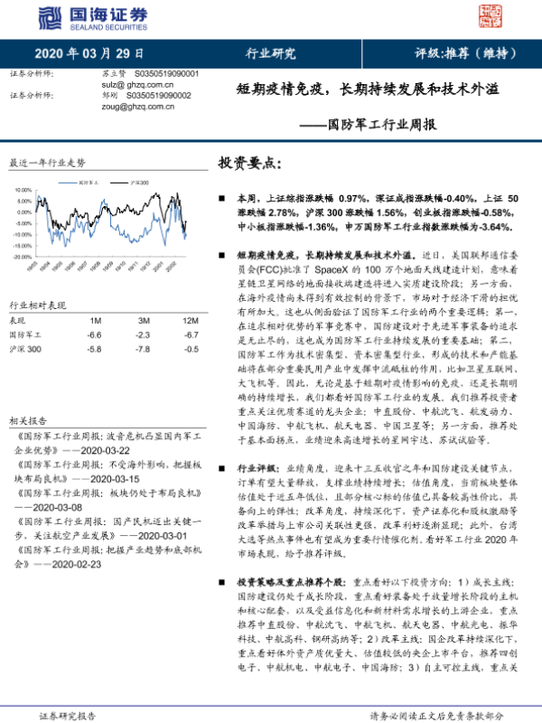 【国海证券】【20200329】国防军工行业周报:短期疫情免疫,长期持续发展和技术外溢-13页